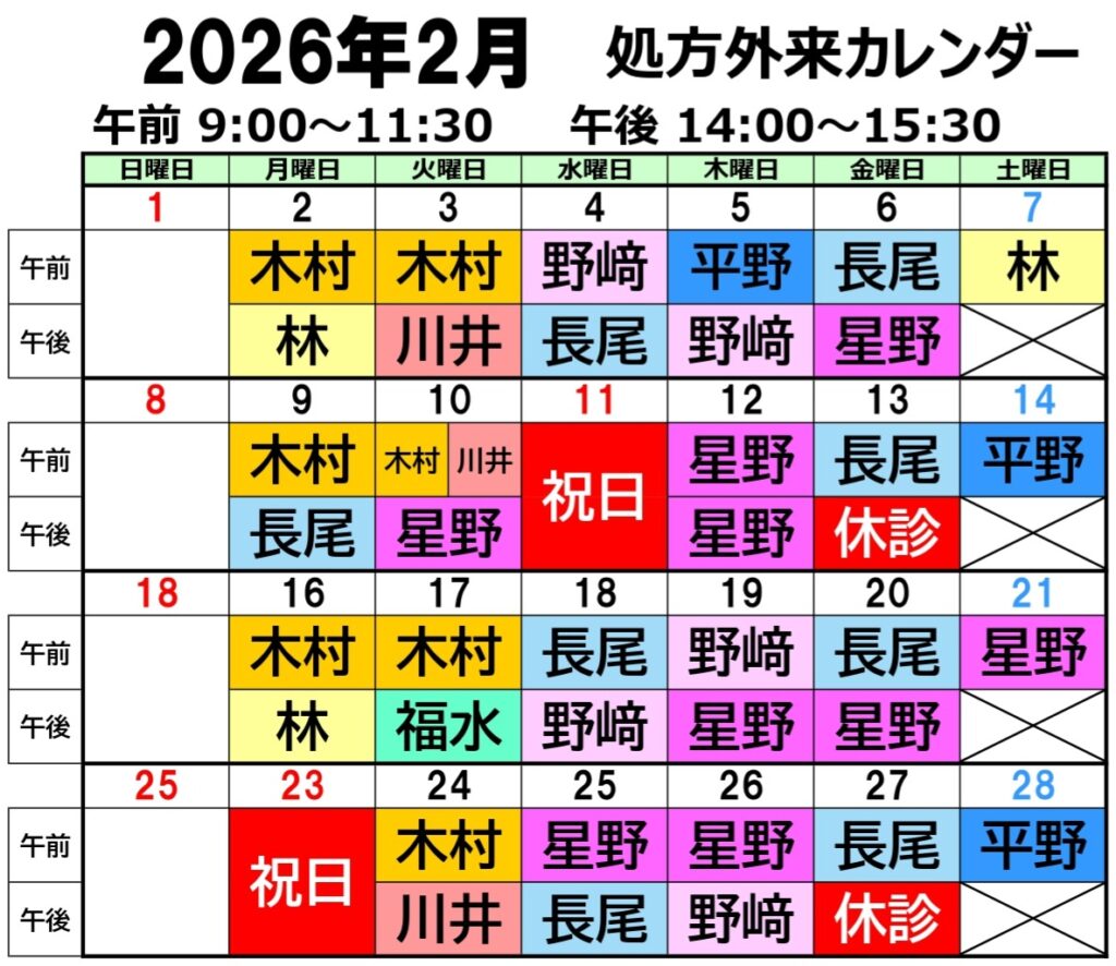 【処方担当医】(1月27日(火)10:00更新) 下記カレンダーをご確認ください。 変更する場合もございますので、来院前にご確認ください。