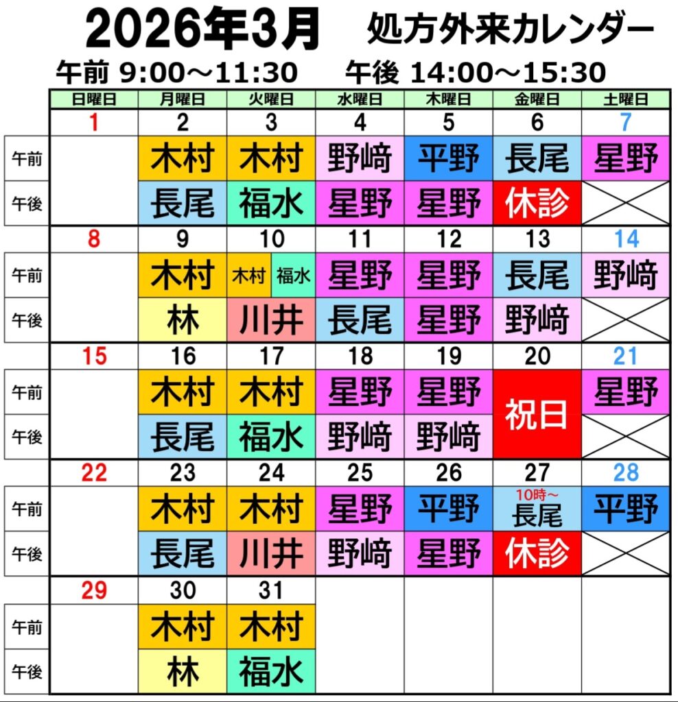 【処方担当医】 下記カレンダーをご確認ください。 変更する場合もございますので、来院前にご確認ください。 ※3月27日(金)の処方外来は10時開始となります
