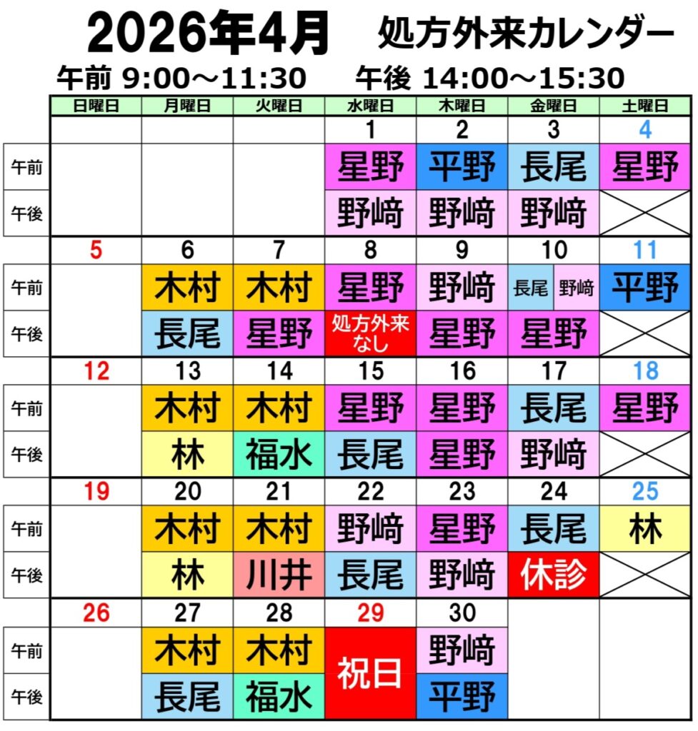 【処方担当医】 下記カレンダーをご確認ください。 変更する場合もございますので、来院前にご確認ください。